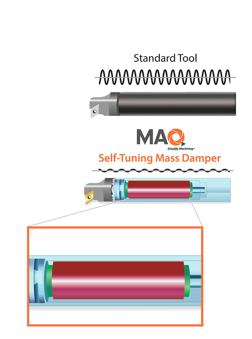 İşleme işlemi sırasında önceden ayarlanmış bir frekansa sahip işleme takım tutucuları kullanmanız veya ince ayar yapmanız gerektiğini düşünebilirsiniz. Tekrar düşün! Kendinden ayarlı kütle sönümleyici (STMD™) takım tutucularımız, CNC işleme takımına ve işlemeye otomatik olarak uyum sağlar. MAQ'nun kendi kendini ayarlayan kütle sönümleyici teknolojisi, tüm titreşim önleyici alet tutucularımızda bulunur ve çok çeşitli frekanslarda titreşimi azaltır. Bu, birden fazla uygulama için aynı titreşim sönümlü takım tutucuyu kullanmanıza olanak tanır. Bir daha asla tuning hakkında düşünmenize gerek yok. Talaşlı imalatta iyileştirilmiş yüzey kalitesi – ilk seferde doğruyu elde edin Tak ve çalıştır – hemen başlayın Bakım gerektirmez - tekrar yapmaya gerek yok